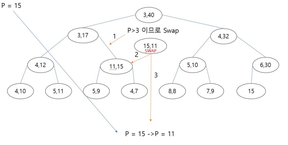스왑 된 우측 자식 노드는 [15,11]의 형태가 되는데 폐구간 트리 형태를 유지하기 위해서 15와 11또한 Swap. 이때 최소값 비교 기준이던 P값인 15 또한 11로 Update